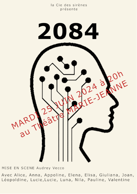 L'atelier Raconte-moi un Théâtre (10/12 ans) présente 2084 d’après Philippe Dorin Adaptation et mise en scène Audrey Vecco Avec Alice, Anna, Apolline, Elena, Elisa, Giuliana, Joan, Léopoldine, Lucie, Lucie, Luna, Myriam, Nila, Pauline, Valentine. Mesdames et Messieurs nous vous prions de nous excuser cette introduction et de profiter de la concentration de vos regards et de votre écoute sur cette scène, ici et maintenant, pour vous faire la plus folle des propositions. Un voyage dans le temps, un voyage dans le futur, un voyage en 2084. Durée : 45 mn P.A.F. 5€